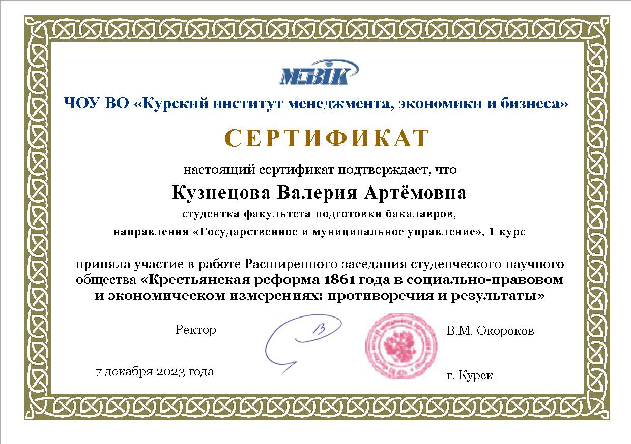 - Кузнецова Валерия Артёмовна, студентка Курского института менеджмента, экономики и бизнеса, группа КБО231МУ40. Тема доклада: «Крестьянская реформа 1861 года: результаты и противоречия»